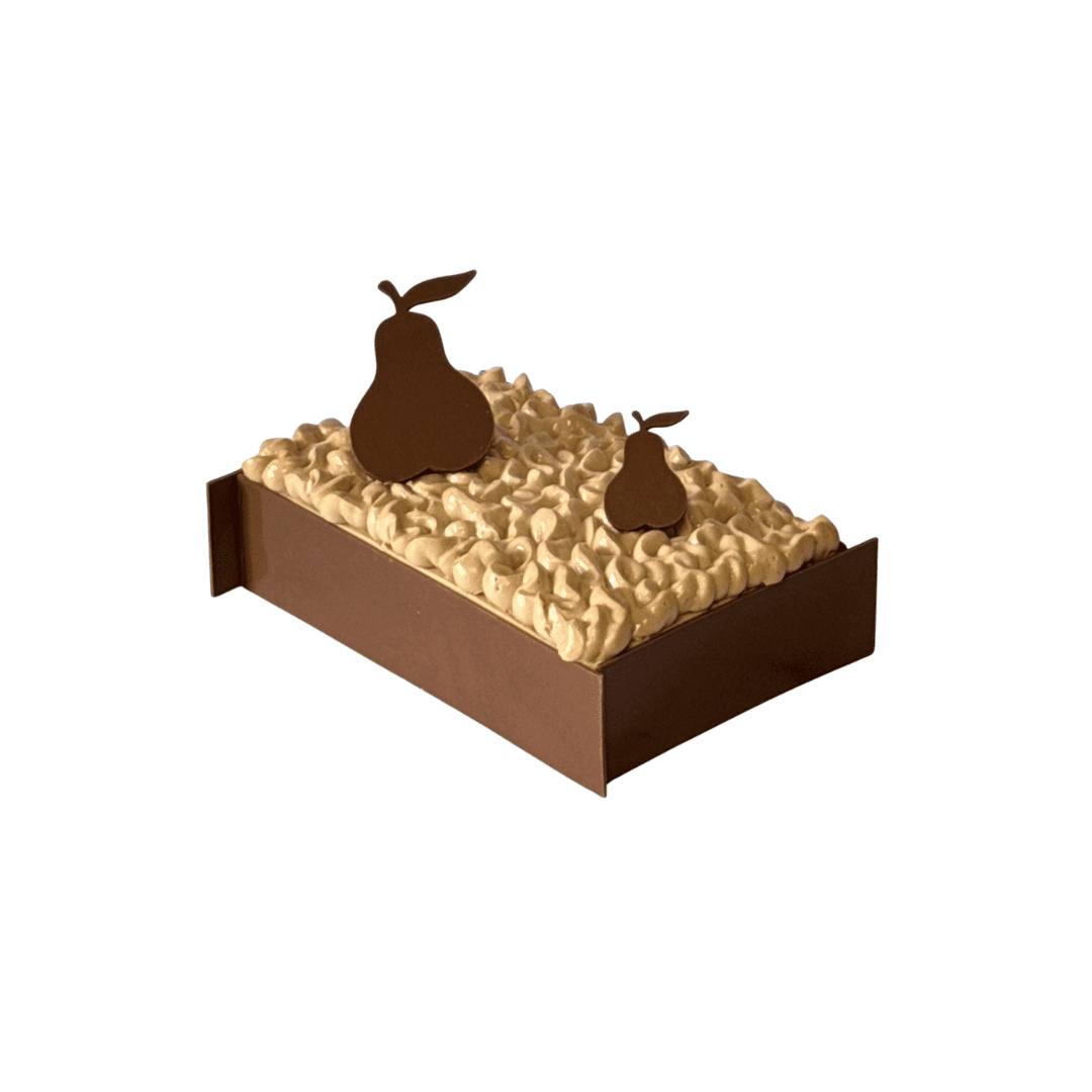 Streussel amandes, biscuit amandes vanille, compotée de poires, mousse chocolat noir Caraïbe