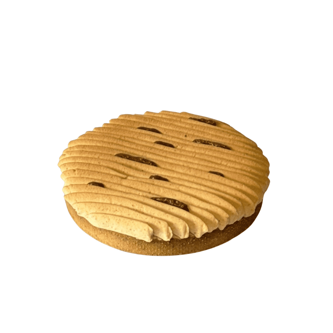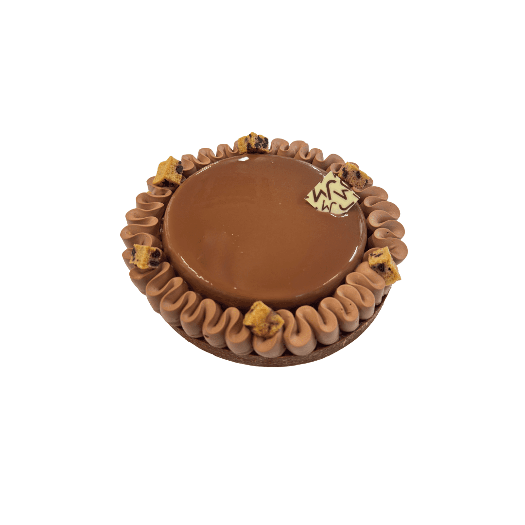 Fond sablé chocolat, biscuit moelleux chocolat, éclats de cookies, crémeux chocolat Azélia, crème brulée vanille