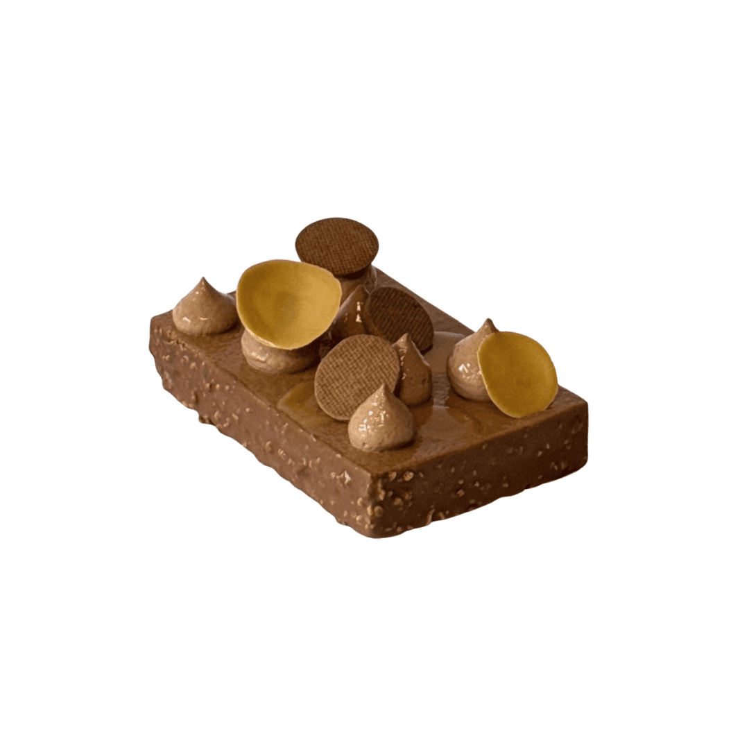 Biscuit chocolat, fond croustillant, palet caramel, mousse chocolat noir Caraïbe